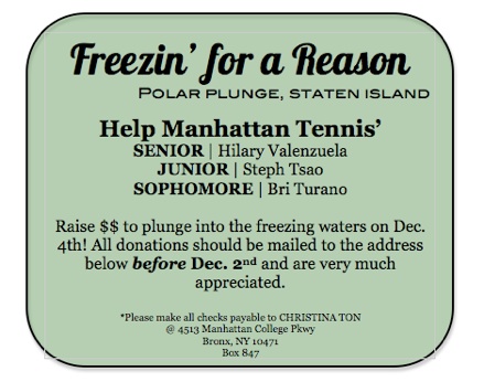 It’s basically a fun way to raise money for the Special Olympics and participate in a memorable and exciting event with other participants. This year, Manhattan College is working on putting together a team of at least 25 students. We are participating in the Plunge on Dec. 4th on Staten Island. Since the event benefits Special Olympic athletes, the head of Manhattan College’s Polar Plunge team decided to look to the athletes first.